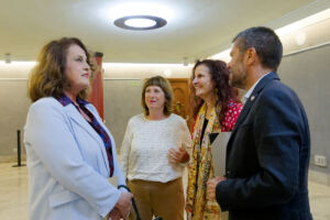 Antonelli, antes del inicio del coloquio con Isabel Castells, Isabel León y el rector Francisco García.