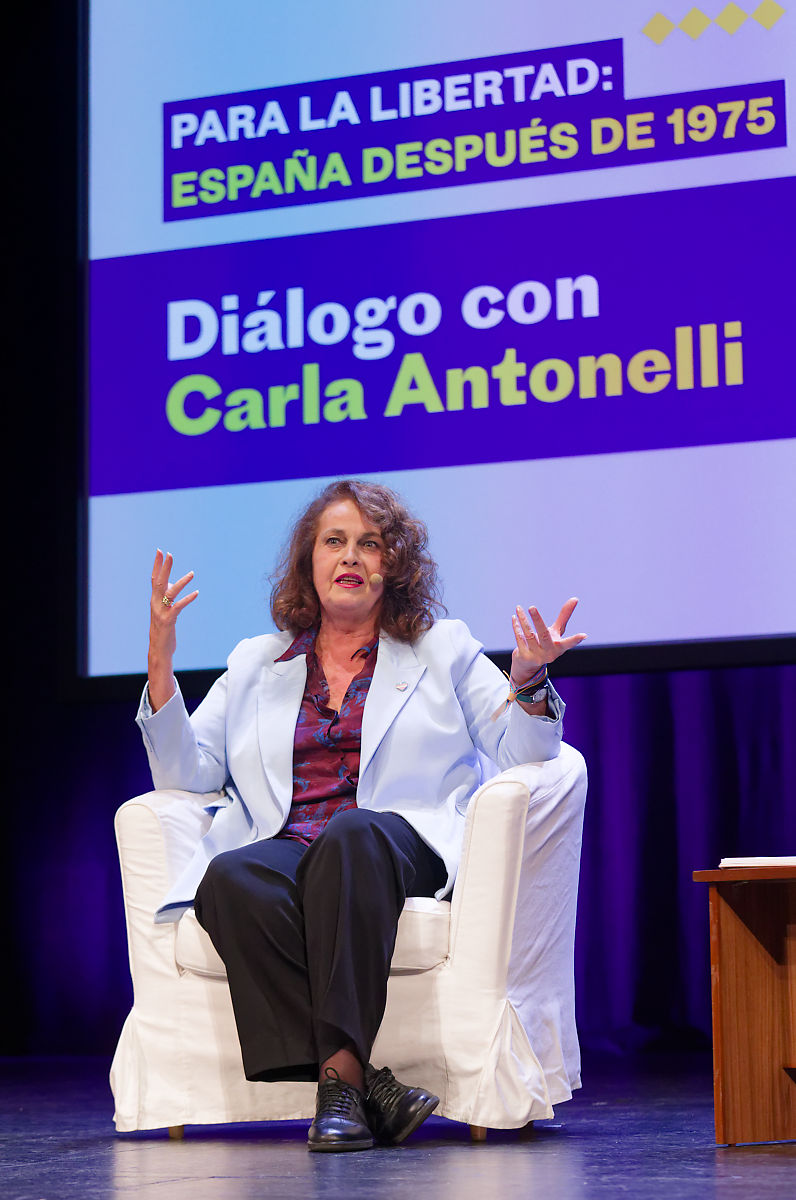 Carla Antonelli mantuvo una amplia entrevista este fin de semana en el Paraninfo con dos alumnas de Filología, Atteneri Dorta Trujillo y Ainara Rodríguez Luis, ante un público expectante y muy entregado, no en vano fue ovacionada durante este coloquio en múltiples ocasiones.