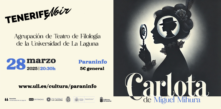 La representación de “Carlota” comenzará a las 20:30 horas en el escenario universitario y las localidades pueden adquirirse online a un precio de 5€ en la plataforma Eco Entradas. Se trata de una pieza del dramaturgo español Miguel Mihura (1905-1977), uno de los autores de comedia más importantes de la tradición española, y su montaje forma parte de las actividades paralelas del festival Tenerife Noir, con el cual colabora la institución académica con diferentes actividades académicas y culturales.