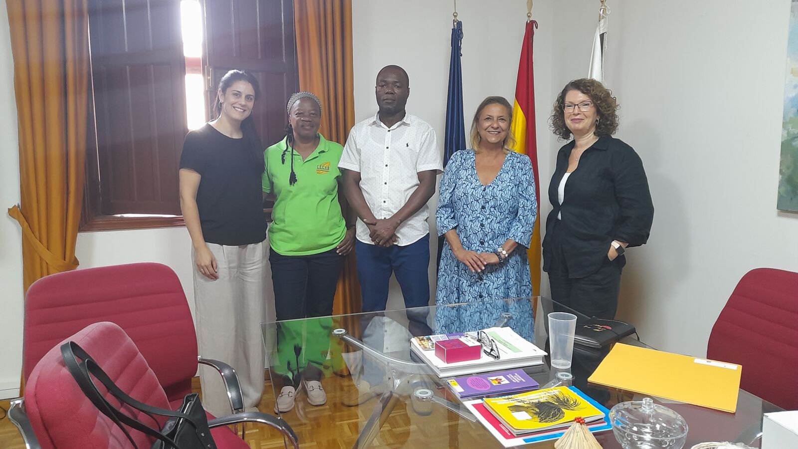 Esta semana ha tenido lugar una reunión entre Inmaculada González, vicerrectora de Internacionalización y Cooperación de la Universidad de La Laguna, Cristina González y Emma Carmelo, investigadoras del proyecto TecnoMac liderado por la ULL, junto con Antonia dos Santos Neto y Dossaví Freitas Pires dos Santos, profesores de la Facultad de Ciencia y Tecnología de la Universidad de Santo Tomé y Príncipe (USTP), quienes se encuentran realizando una estancia formativa en el marco de dicho proyecto.