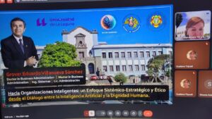 La jornada incorporó además una mirada tecnológica y educativa a través de la intervención de Iván Santelices (Universidad del Bío-Bío, Chile), quien analizó la convergencia entre simulación, realidad virtual y realidad aumentada como herramientas de aprendizaje potenciadas por IA. Por su parte, Rafael Lorenzo Martín (Universidad de Holguín, Cuba) abordó el futuro educativo desde la ética de la inteligencia artificial generativa, proponiendo una “sociedad del afecto” donde la sabiduría humana complemente las capacidades de los algoritmos.