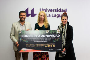 En el centro de la imagen, la vocal de la Asociación Española contra la Meningitis, acompañada del rector y de la vicerrectora de Cultura.