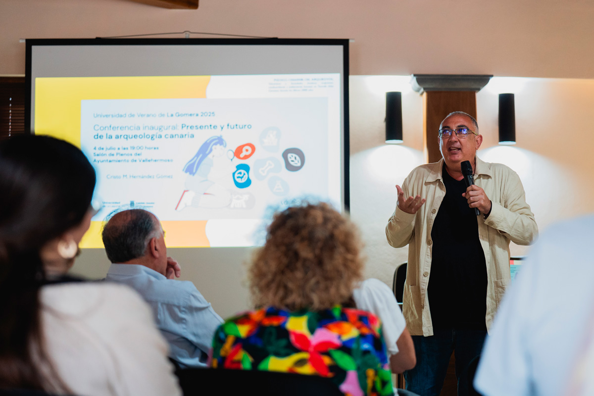 La Universidad de Verano de La Gomera dio comienzo a su edición 2025 el pasado viernes, 4 de julio, con la celebración de su acto inaugural en el Salón de Plenos del Ayuntamiento de Vallehermoso. La jornada comenzó con la conferencia «Presente y futuro de la arqueología canaria», impartida por el profesor Cristo M. Hernández Gómez, docente e investigador de la Universidad de La Laguna, quien ofreció una intervención vibrante, cargada de referencias personales, datos históricos y reflexiones sobre el papel que juega hoy la arqueología como herramienta de construcción social, científica y cultural. El acto marcó así el inicio de una programación académica que, un año más, apuesta por acercar el conocimiento universitario a todos los rincones del territorio gomero y fomentar la formación continua entre la ciudadanía.