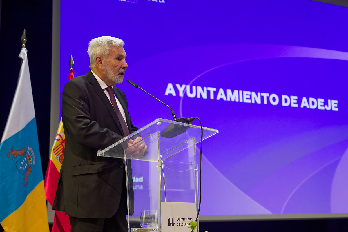 El rector tuvo palabras de elogio para todas las personas premiadas, por representar ese compromiso con el conocimiento y los valores de la institución académica; para la Asociación de Antiguos Alumnos y Amigos de la Universidad de La Lagua, por ser un puente con la sociedad y alentar el sentimiento de pertenencia a la institución; y al Ayuntamiento de Adeje, que recibió el Premio al Mecenazgo por su apuesta por la universidad pública, la cual ha sido un factor influyente en la transformación del municipio.