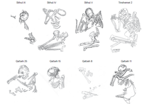 También se encuentran numerosas similitudes en cuanto al simbolismo y el tratamiento de los muertos. Destaca, en primer lugar, el uso del ocre en los enterramientos. En Tinshemet y los otros yacimientos relevantes de la misma cronología se han utilizado en los enterramientos, a menudo espolvoreado encima del difunto o colocando grandes trozos de ocre al lado de los fallecidos. Otro elemento compartido en todos estos yacimientos es cómo enterraron los difuntos, ya que fueron depositados de la misma manera: en posición fetal y sobre el lado derecho del cuerpo, sin distinción de sexo, edad o especie, tal y como se puede ver en la figura 5 del artículo.