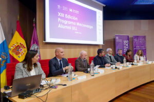 La mesa presidencial estuvo integrada por Francisco García, rector de la Universidad de La Laguna; Luis Ortigosa, presidente de Alumni ULL; Oliver González, director general de Fundación CajaCanarias; Jesús Carlos Álvarez, director de Instituciones y Dirección Territorial de Canarias de Caixabank; Carlos Alberto González, director de Estrategia, Datos y Sostenibilidad de Cajasiete; Ana Belén López, vicepresidenta del Grupo Fedola; Sara Mateos Artiles, directora de Fundación DISA, y Ángela María Ortega Benítez, vocal de la Junta de Gobierno del Colegio Oficial de Enfermeros de Santa Cruz de Tenerife.