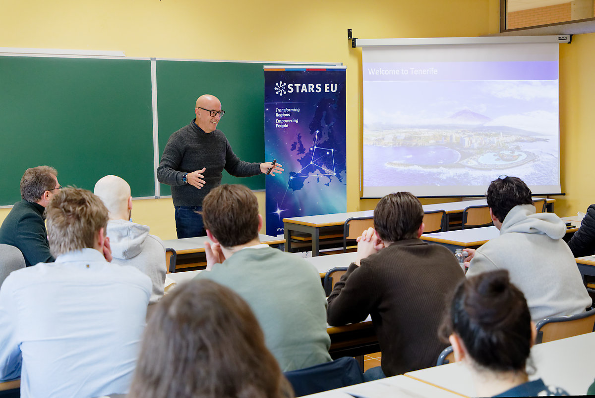 Durante la sesión de apertura, los profesores de la Universidad de La Laguna Juan Albino Méndez y Rafael Arnay, ambos del Departamento de Ingeniería Informática y de Sistemas, presentaron el programa de esta semana de trabajo, que se centrará sobre todo en la tutorización de proyectos prácticos que los 32 estudiantes asistentes deben desarrollar en grupos y presentar el viernes 23 de enero. También serán impartidos dos seminarios, uno sobre análisis de datos con el software Knime y otro acerca del machine learning en sistemas de energía. A esa primera sesión también acudió José Sigut, director de Secretariado de Movilidad y Cooperación con Europa y Norteamérica y coordinado de STARS EU en la institución, para dar la bienvenida al alumnado foráneo.