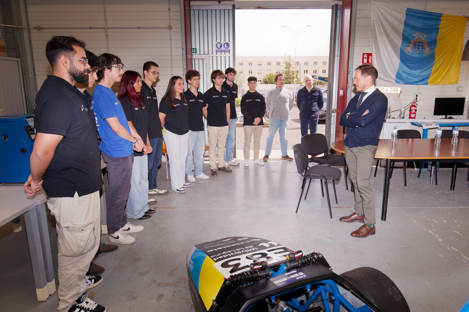 El consejero de Transición Ecológica y Energía del Gobierno de Canarias, Mariano Hernández Zapata, visitó el pasado jueves 5 de marzo, el taller del Canarias Racing Team, para conocer de primera mano el trabajo que desarrolla el único equipo de Formula Student del archipiélago.