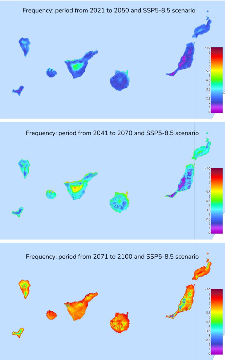 En términos de frecuencia, el estudio muestra un incremento notable en el número anual de episodios de calor en todas las islas, con diferencias en función de la localización y la proximidad a África. Las islas orientales, en particular Fuerteventura, son las que podrían experimentar mayores incrementos, alcanzando hasta 6,5 eventos adicionales por año, en los escenarios más pesimistas. Si bien la frecuencia inicial de las olas de calor en todas las islas es relativamente baja, siendo de menos de un evento por año en la actualidad, los aumentos que se proyectan indican un cambio sustancial en los patrones climáticos regionales.