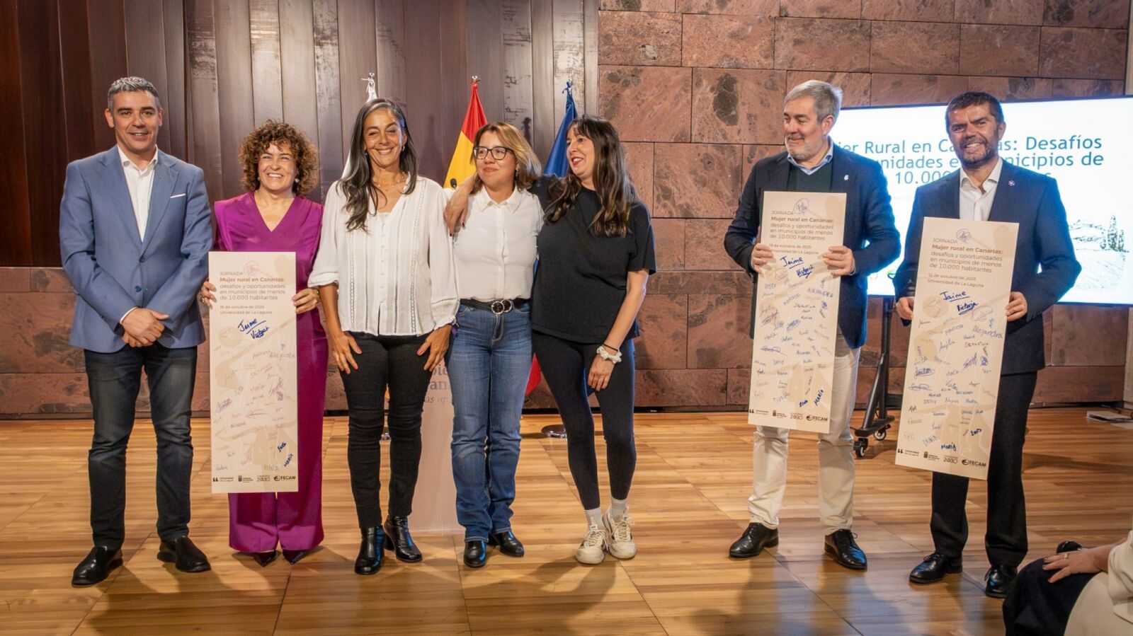 Durante el encuentro, Noelia Cruz, coordinadora de la jornada y miembro de esta cátedra fue la encargada de presentar las principales conclusiones y tres de las ponentes de esa jornada entregaron cartones plumas con la imagen gráfica de las Jornadas del 2025, firmados por las participantes en el evento, a los representantes del Gobierno de Canarias, la Universidad de La Laguna y la Federación Canaria de Municipios (FECAM).