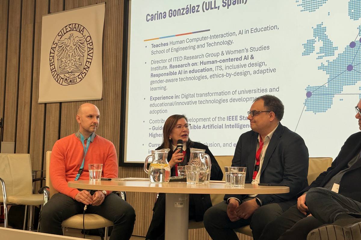 Tras la apertura, la sesión se trasladó a la Facultad de Políticas Públicas, sede de las reuniones de trabajo, en cuya sesión de mañana se celebraron dos paneles simultáneos de debates abiertos: “Inteligencia Artificial centrada en las personas y vías flexibles: haciendo una transformación digital realmente transformadora”, con la intervención de la catedrática de Arquitectura y Tecnología de Computadores de la Universidad de La Laguna Carina González; y “Del aula a la región: educación transformadora como motor para la transición europea”, que contó con la participación de Ángel Acebes, del área de Fisiología del centro canario.