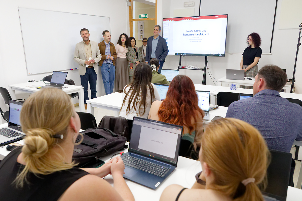 La primera sesión comenzó con un taller impartido por Julia Laín López, en el que se exploraron las posibilidades avanzadas del power-point como herramienta más allá de la presentación convencional, incorporando recursos visuales, animaciones y claves de comunicación no verbal para mejorar la exposición en público.