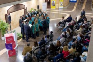 público con un repertorio que incluyó el ‘Hallelujah’ de Leonard Cohen, con arreglos del propio director, ‘La cucaracha’, con arreglos de Jonathan Rathbone y, finalmente, ‘Y en Septiembre’ de Albert Alcaraz y letra de Andrés Estévez, pieza compuesta especialmente para el Coro por el compositor Albert Alcaraz con motivo de la celebración de su 40 aniversario y que recoge una parte de los sentimientos y emociones de los comienzos cada septiembre en la Universidad de La Laguna.