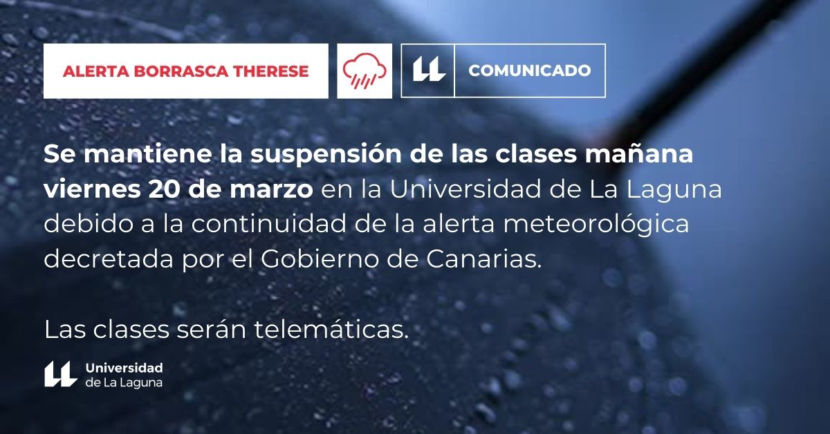 Ante las previsiones meteorológicas actualizadas, el rectorado de la Universidad de La Laguna ha comunicado a su comunidad que se mantiene para este viernes 20 la actividad en los términos que habían sido fijados para el día de hoy, jueves 19: actividad académica en modalidad telemática y actividad técnica, administrativa y de gestión en formato de teletrabajo, excepción hecha de los servicios esenciales. Igualmente se mantiene la suspensión de los servicios deportivos y las actividades culturales.