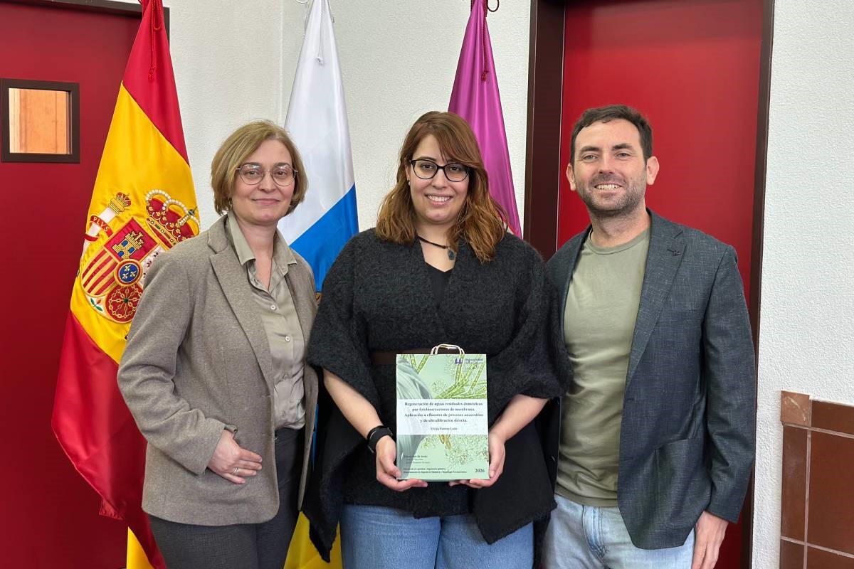 La Sección de Química de la Universidad de La Laguna ha acogido recientemente la defensa de la tesis doctoral titulada “Regeneración de aguas residuales domésticas por fotobiorreactores de membrana. Aplicación a efluentes de procesos anaerobios y de ultrafiltración directa”, presentada por Elvira Ferrera León. La investigación desarrollada por la ya doctora analizó la capacidad de diferentes tecnologías novedosas y emergentes para el tratamiento de aguas residuales urbanas bajo un modelo de gestión sostenible, basado en la economía circular. Esto es fundamental en un contexto global, marcado por la escasez de agua, el aumento de la demanda de recursos y la necesidad de mejorar la gestión de residuos.