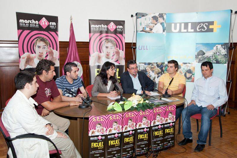 La vicerrectora de Alumnado de la Universidad de La Laguna, Juana María Rodríguez Gómez; el concejal de Deportes, Juventud y Atención a las Drogodependencias, Francisco Javier Álvarez Iglesias; representantes de los grupos claustrales y de Marcha FM, presentaron las actividades del Festival de Inicio de curso ULL (FICULL) 2010.