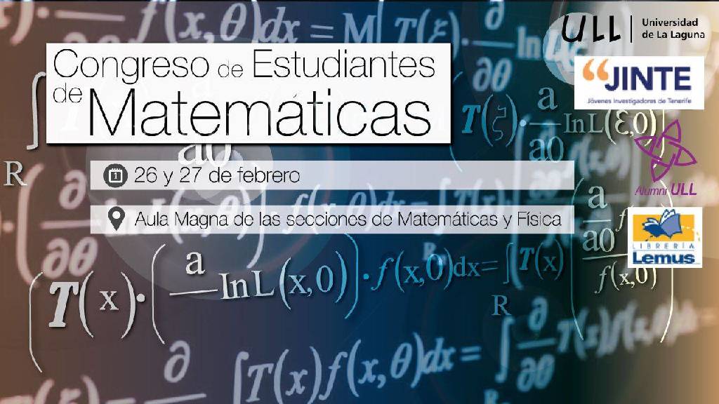 La sección de Matemáticas de la Universidad de La Laguna celebrará la primera edición del Congreso de Estudiantes de Matemáticas que tendrá lugar este próximo jueves y viernes, 26 y 27 de febrero, en el Aula Magna del citado edificio en horario de tarde. Durante este evento, el alumnado del centro presentará los resultados de sus proyectos, al tiempo que se llevarán a cabo conferencias y otras actividades cuyo objetivo es fomentar la vocación científica de los alumnos.