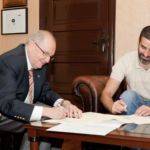 El rector de la Universidad de La Laguna, Eduardo Doménech, y el presidente del club de baloncesto Tefesur, Alonso Reyes,…