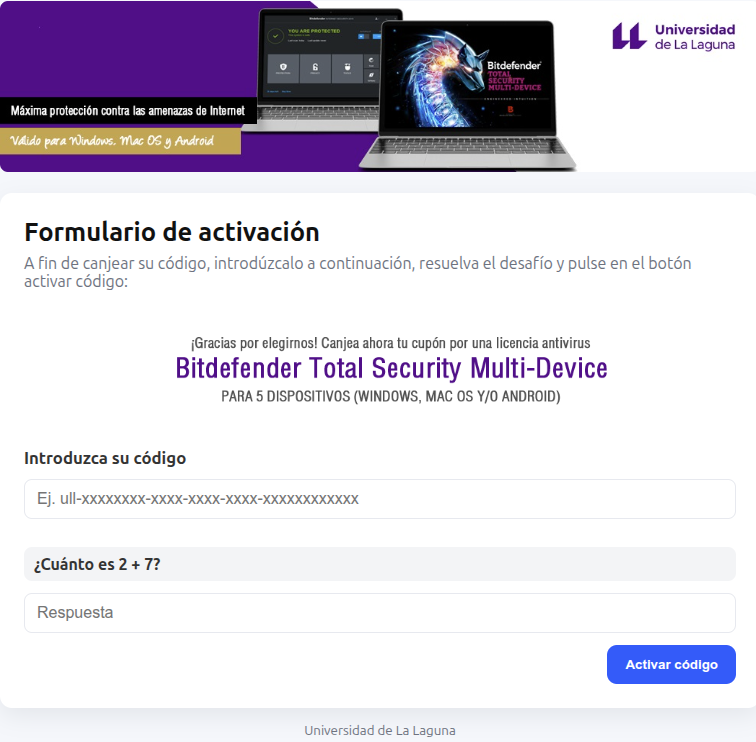 Adicionalmente el alumnado y el resto de colectivos pertenecientes a la comunidad universitaria que dispongan de una dirección de correo institucional (@ull.edu.es) podrán adquirir una licencia de Bitdefender Total Security Multi-Device a un precio reducido aplicando el cupón ULLSECURITY50 en el momento de la compra.