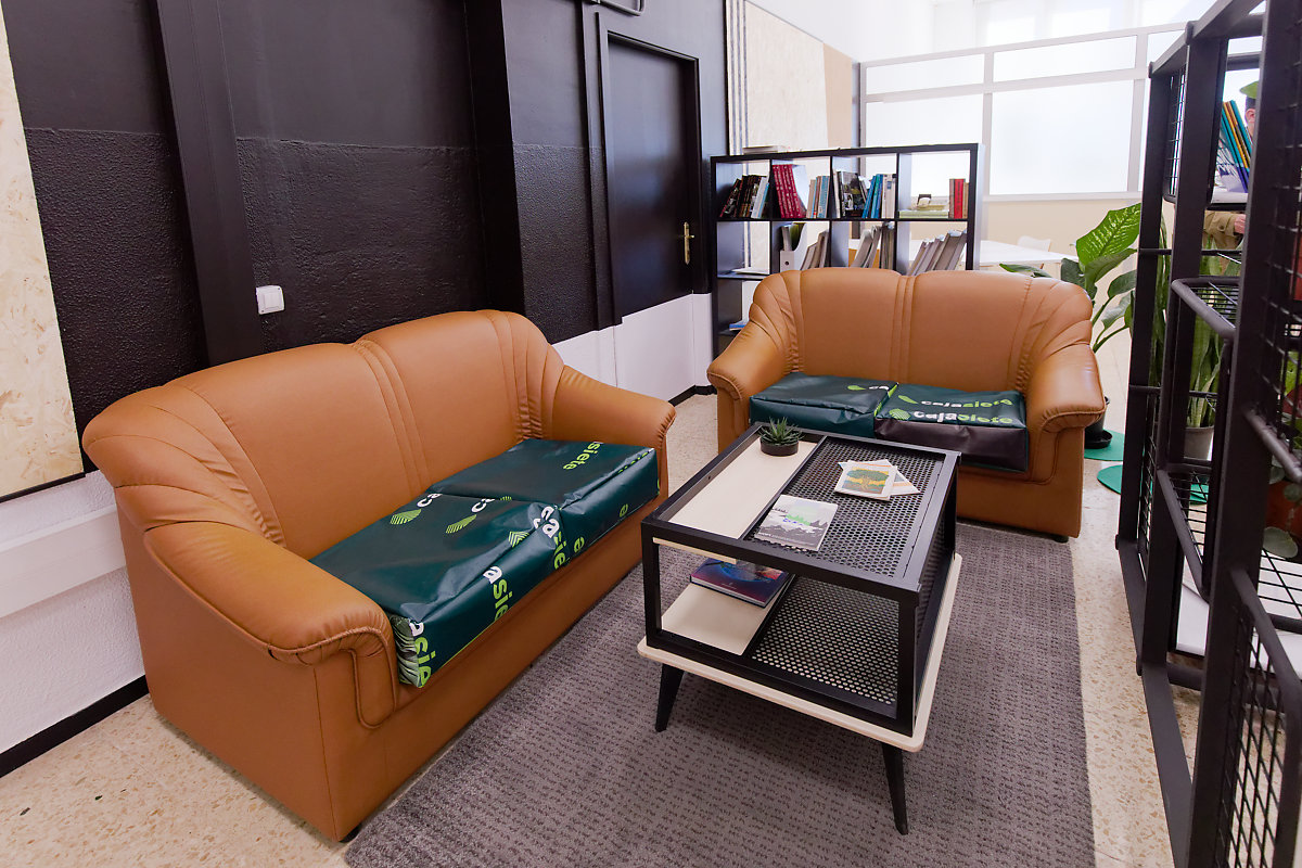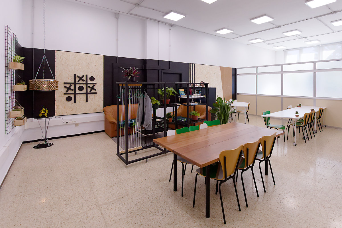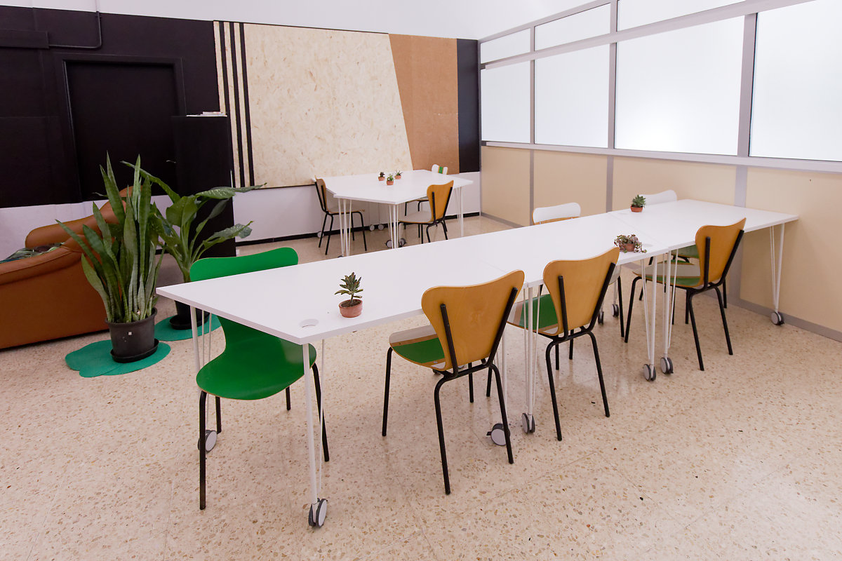 Descripción: Espacio dotado de seis mesas de trabajo y nueve sillas que se pueden adaptar a las necesidades de los usuarios. Dispone además de zona de lectura con dos sofás, una mesa grande con seis puestos y dos microondas.
