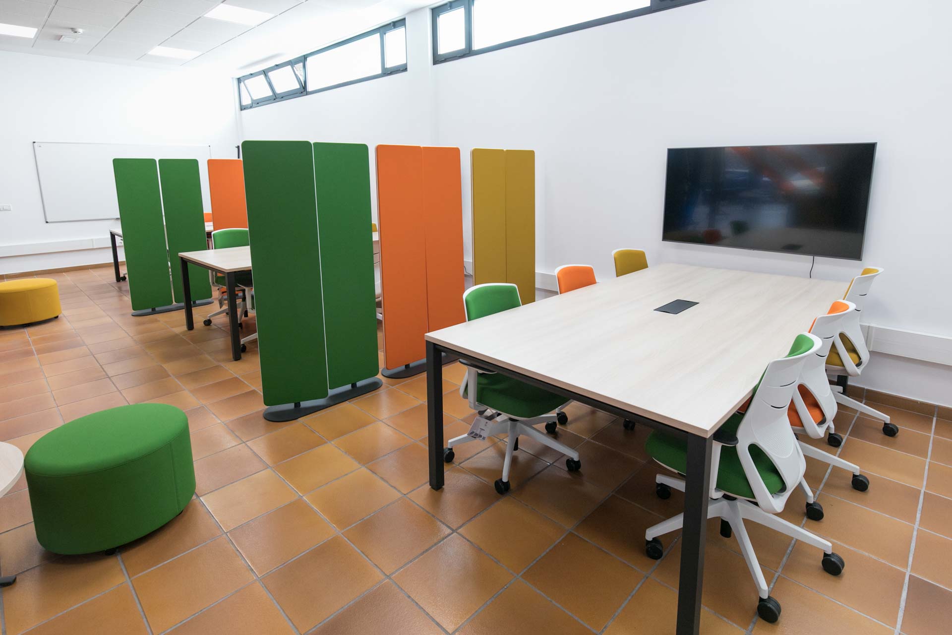 Descripción: El espacio dispone de 3 mesas grandes con 6 sillas cada una, unos biombos que separan cada zona, tres pantallas grandes, una en cada zona de trabajo, más unas mesas bajitas con 6 puffs y dos pizarras en la pared.